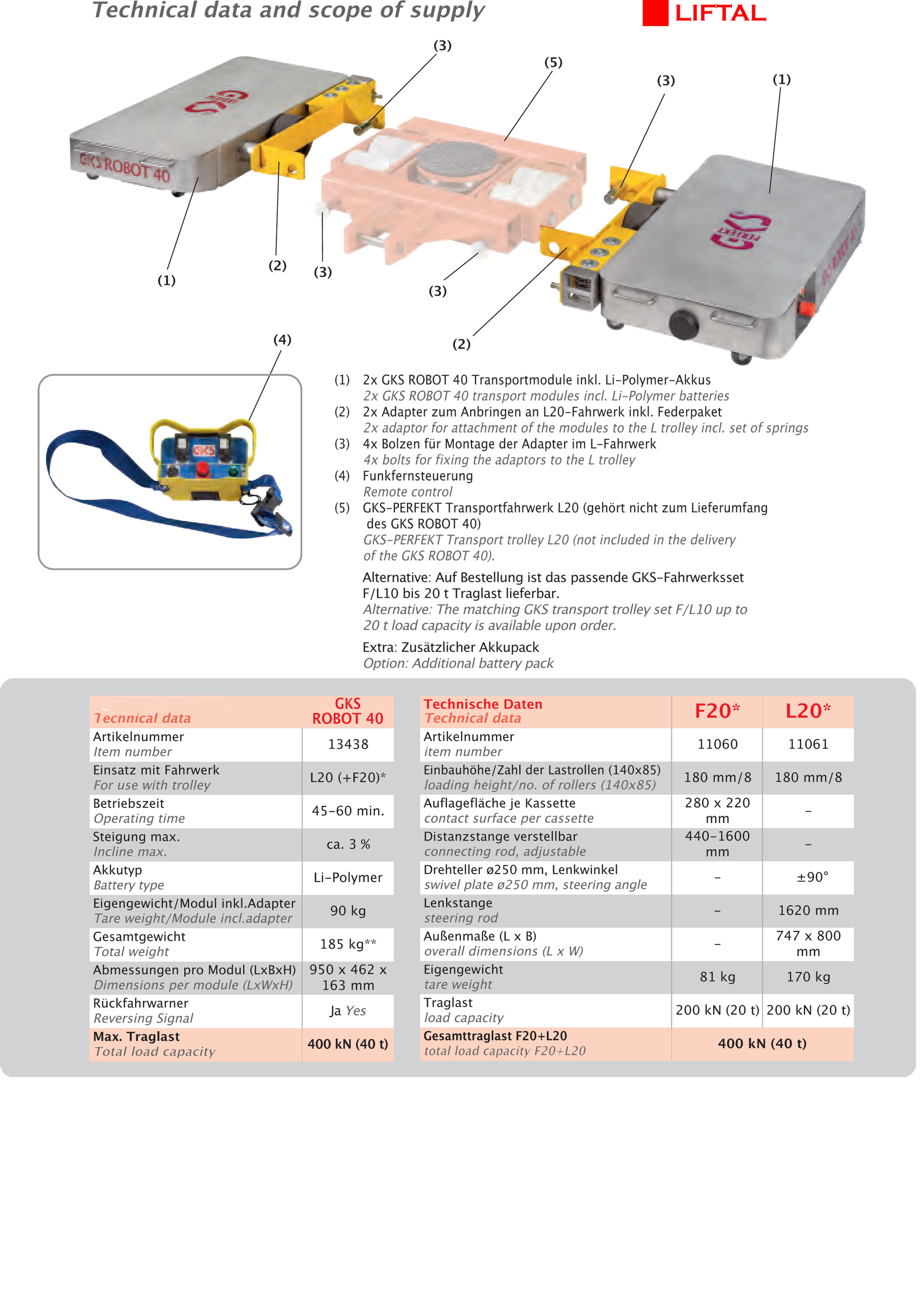 No power cords, hydraulic or compressed air hoses necessary. - The carrying of the load (by the transport trolley L20) is seperated from the propulsion