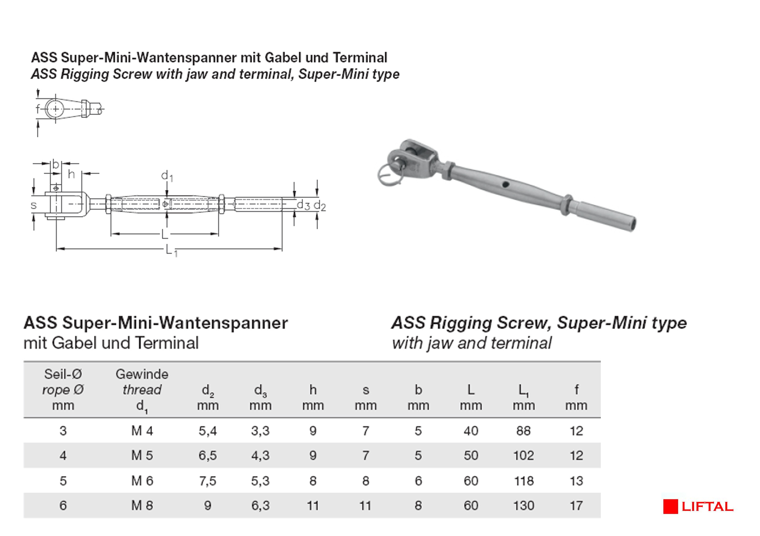 ASS rigging screw, Super-Mini type with jaw and terminal